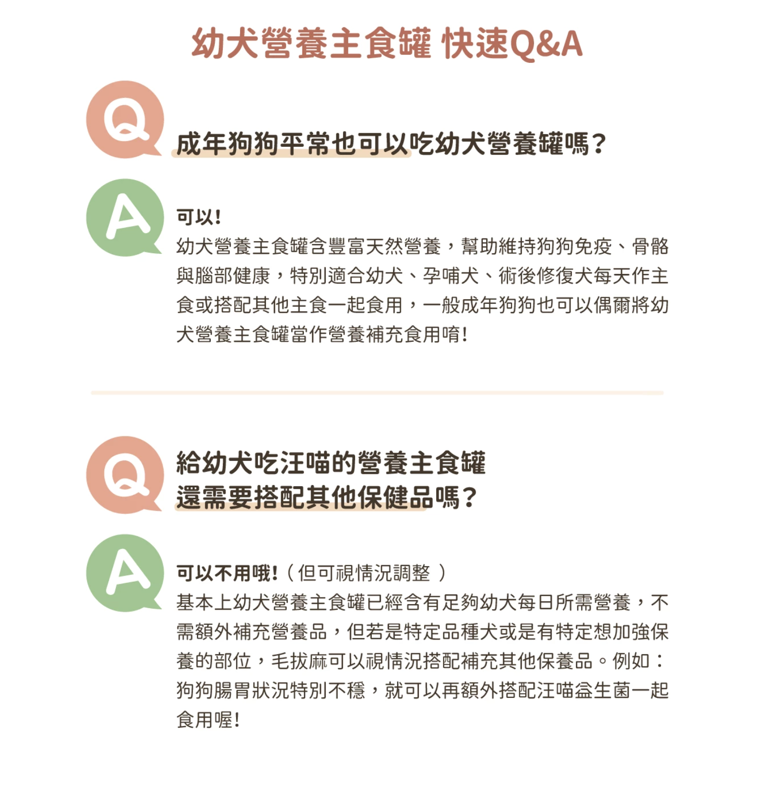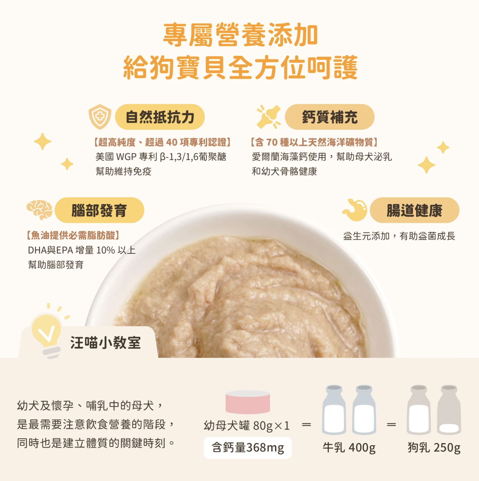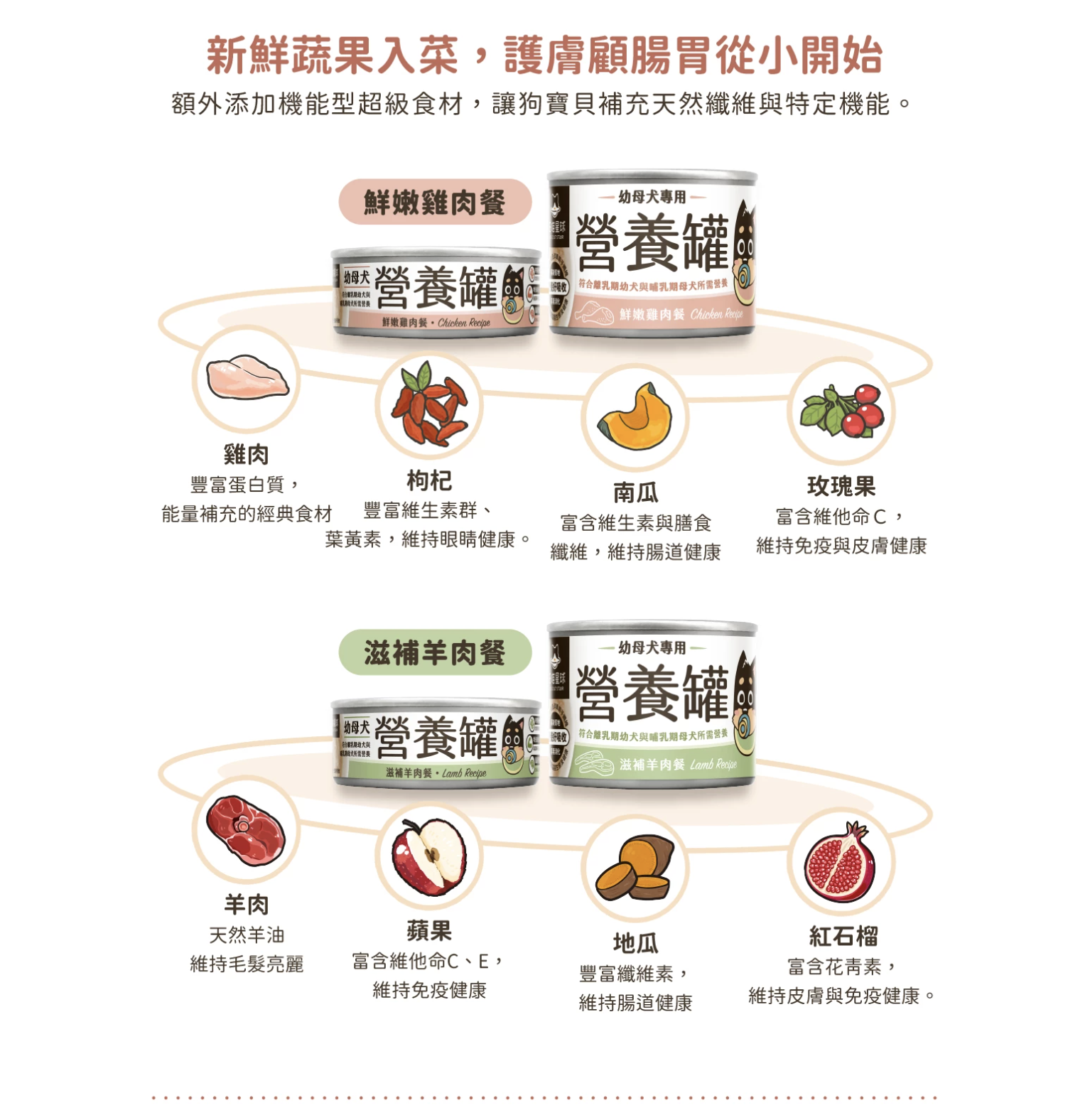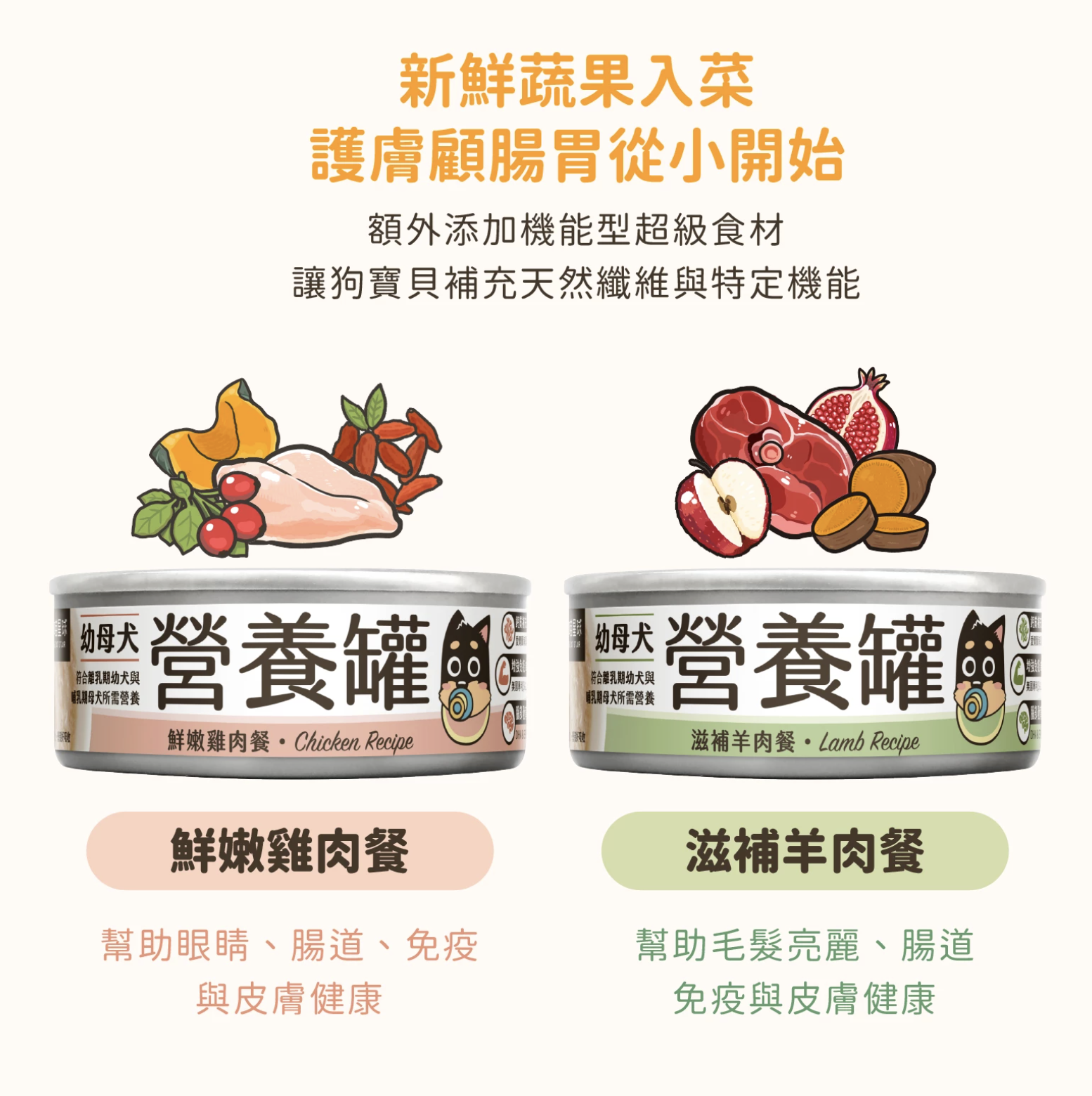 專為幼犬、哺乳孕犬、術後修復期犬隻設計的營養主食罐,添加關鍵營養素