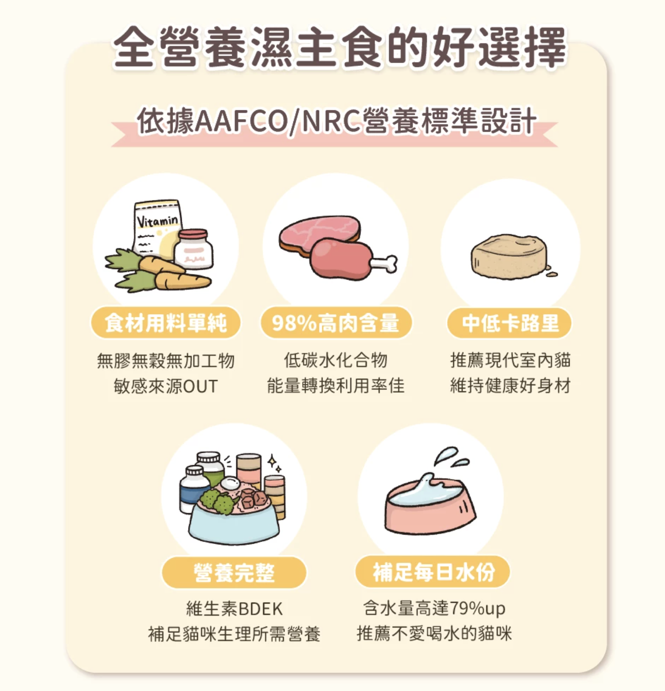 全配方採用98%高含肉量與低碳水設計,提供完整均衡營養。