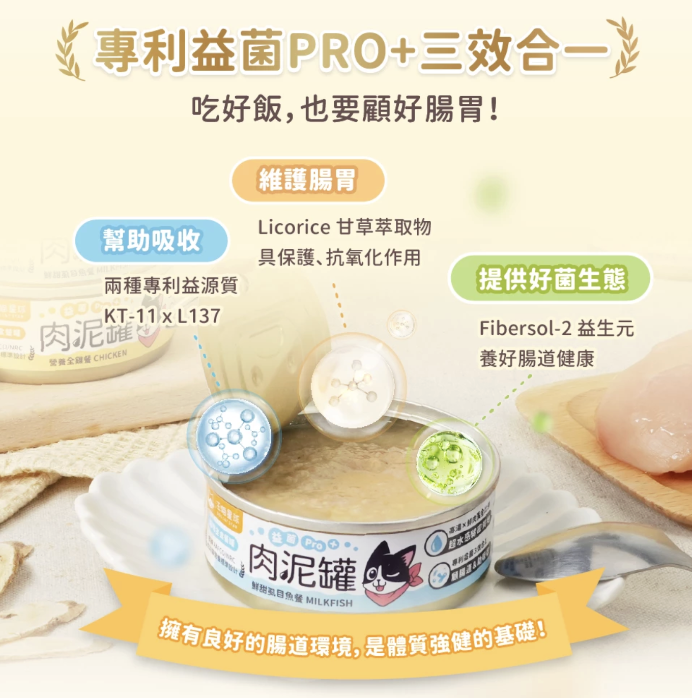 添加專利益菌三合一配方,幫助維持腸道健康、促進消化吸收,每一餐都吃得安心又營養